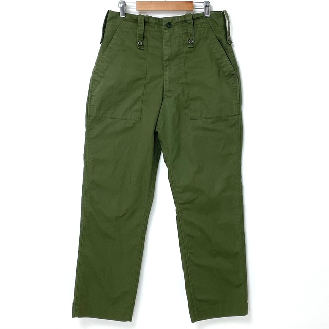 【レアサイズ】70s アメリカ軍 OG-107 コットンサテン ベイカーパンツ フロントボタンタイプ サイズ38x33 米軍放出品の実物ミリタリーファティーグパンツ 1970年代の希少な軍パンです とても人気が高く男女問わず年齢関係なく穿かれていますが、入手困難で価格も高騰中 見つけたらゲットしてほしい米軍ベイカーパンツ 今後は更に手に入りにくくなり、幻のパンツになるかもしれません 小さいサイズはまだ見ますが、この日本人にジャストサイズや大きなサイズは、本当に出てきません 【ブランド】 MILITARY SURPLUS (ミリタリーサープラス) アメリカ軍放出品 【カラー】 OG-107 【素材】 コットンサテン 【サイズ】 表記:38 x 33 実寸:ウエスト91cm レングス65.5cm 股上36cm わたり幅34cm 裾幅22.5cm 【状態】 B S : 新品・デッドストック・未使用 A : ニアニュー、使用感が少なく目立つ汚れやダメージがほどんどない美品 B : 使用感はあるが、目立つ汚れやダメージがない、または少ない C : 着用に問題はないが、目立つ汚れやダメージがある商品 D : 大きなダメージや破れなどがある訳アリ商品 *1点物になります *サイズは平置き実寸ですので、多少の誤差がある場合がございます *古着、またはデッドストック品ですので、予めご理解のほどよろしくお願いいたします *検品は行っておりますが、見逃している箇所があるかと思いますので、予めご了承ください *撮影上、微妙な色の違いがあったり、ご覧になるデバイス環境によっても色合いが多少異なってくる場合がございますので、ご理解のほどよろしくお願いいたします